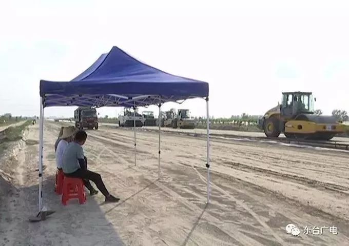 7月18日下午,东台市电视台记者深入长顺建设集团344国道施工现场进行报道。现场,水稳摊铺机在载重卡车的配合下,不停向东推进,设计厚度达17厘米的水稳基层迅速铺设形成,压路机跟进压实,洒水车和养护工人紧随其后,用白色土工布对铺设完成的水稳层进行覆盖,洒水保养,保证施工质量。