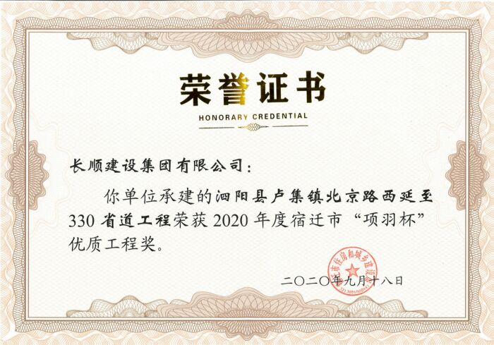 近日,由长顺建设集团承建的“泗阳县卢集镇北京路西延至330省道工程”荣获2020年度宿迁市“项羽杯”优质工程奖。