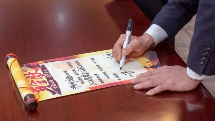 随后,为更好达成2022年度责任指标,号召各项目公司齐心协力、携手奋进。各项目公司总经理及营销负责人轮番上台与孙炳良董事长共同完成2022年度的经营指标责任书签署,为新一年业绩目标的使命必达作出庄严承诺。