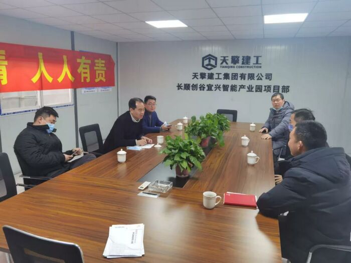 戴军总裁向周雪强书记一行介绍了长顺创谷(宜兴)智能产业园的建设情况。长顺创谷(宜兴)智能产业园总规划占地200亩,一期规划总建筑面积约10.7万平方,由15栋单体楼组成,项目计划于2023年4月竣工交付。自2021年10月项目正式动工以来,截止春节前,已完成主体施工3万余平方;项目的招商工作也已全面启动,园区已成功招引了一批创新型优质企业。